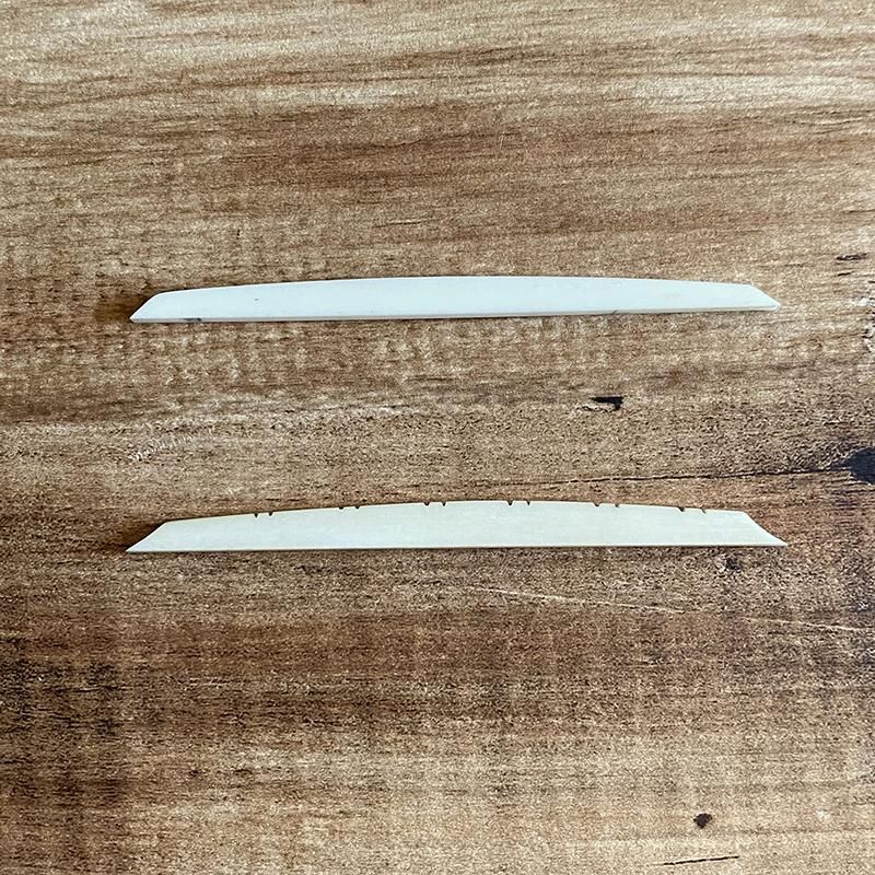 また、弦高調整のためブリッジサドルは数回交換されており、ケース内に以前使用されていたサドルが2個残っていますが、現状の弦高は12フレットで6弦:約2.8mm、1弦:約2.0mmと弾き易い高さでセットアップされています。