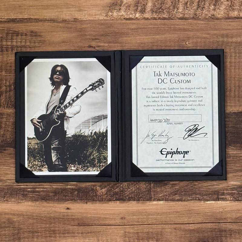 2009年に発売となったエピフォン製TAK松本モデル“ダブルカッタウェイ”モデルの第一弾は限定モデルとして生産され瞬く間に完売となりましたが、2014年にエボニー指板、60sスタイル・スリムネック、ゴールド・ジャックプレートとさらにGibson Custom Shop製「TAK MATSUMOTO DC CUSTOM EBONY」に迫るアップグレードが施され再発されたモデルです。