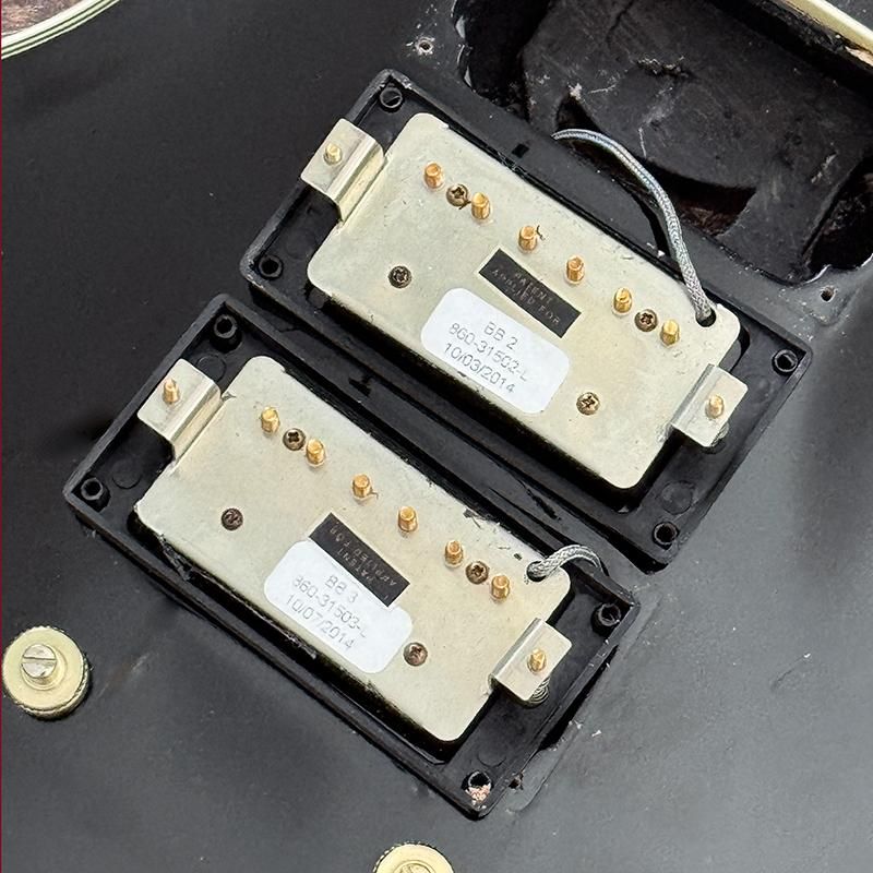 ブリッジやテイルピース等ゴールドハードウェアにはメッキのくすみや一部剥がれがあり、全体的に細かい傷は見られますが塗装が剥がれるような大きな傷はなく、ネック回りも良好でトラスロッドも両方向に余裕あり、フレットの減りも少なく良い状態をキープしており、またこの時期のエピフォン、ギブソンでよく見られるコントロールノブ内側の割れがフロントヴォリュームコントロールノブに見られたため当店入荷後同タイプへ交換しているコンディションの良い1本です。