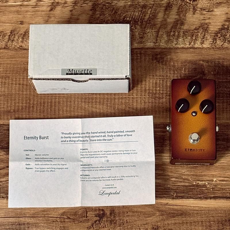 Loverpedalの傑作オーバードライブペダル、Eternityの初期仕様を再現したサンバースト塗装とハンドワイヤリングで限定復刻されたモデルとなります。