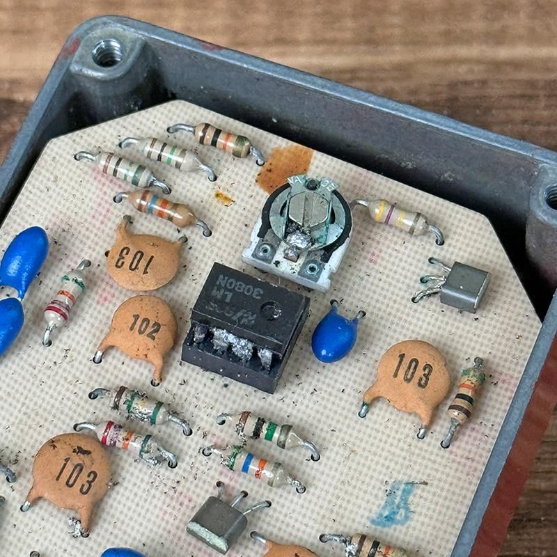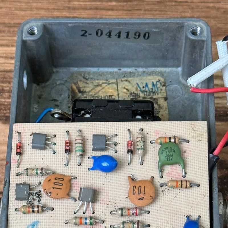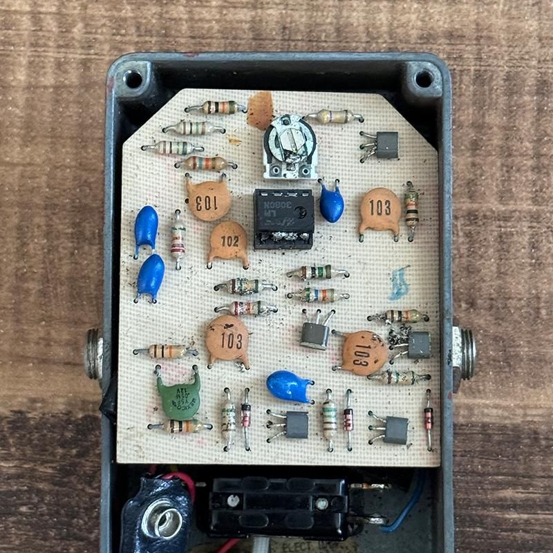 初のコンパクト型コンプレッサーとして1973年頃に登場したダイナコンプのスクリプトロゴからブロックロゴへと変更され、オペアンプも缶タイプのRCA CA3080からナショナルセミコンダクター製LM3080Nへと変更された初期のタイプとなり、ポットデイトは「13777951」「1378005」と1979年51週&1980年5週生産の1980年製となります。