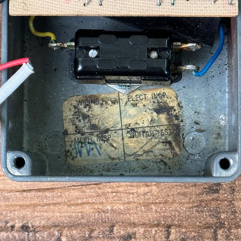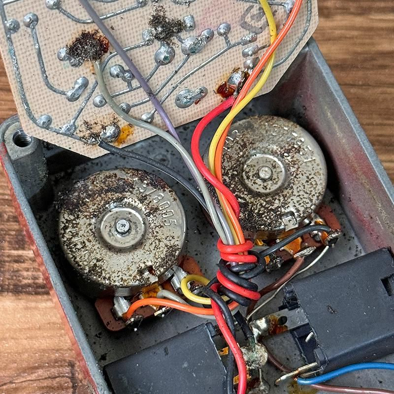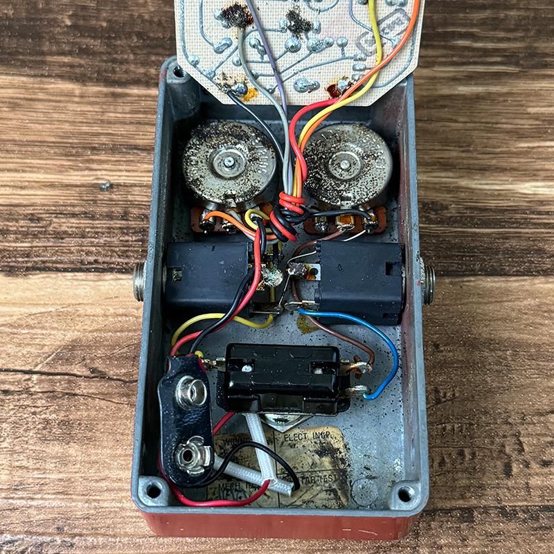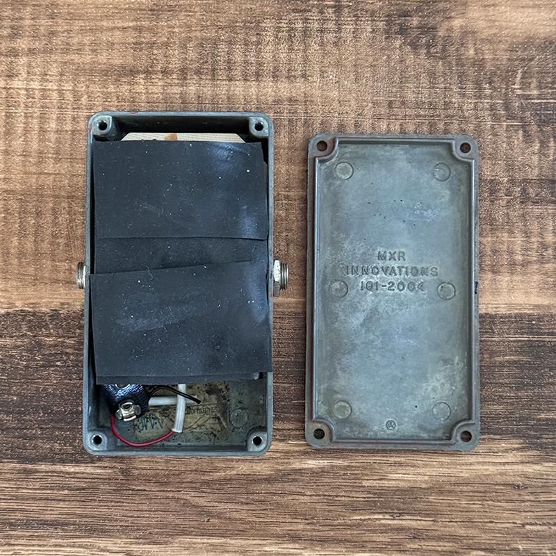 基盤を固定せず絶縁シートを使用しないヴィンテージMXRでは定番となってしまっている内部の基盤とポットの錆や腐食が見られ、保護用のスポンジはラバータイプへと交換されており、またDCジャック用の穴が筐体に開けられていますが現在はオリジナル状態のバッテリー駆動のみの仕様へと戻してあります。